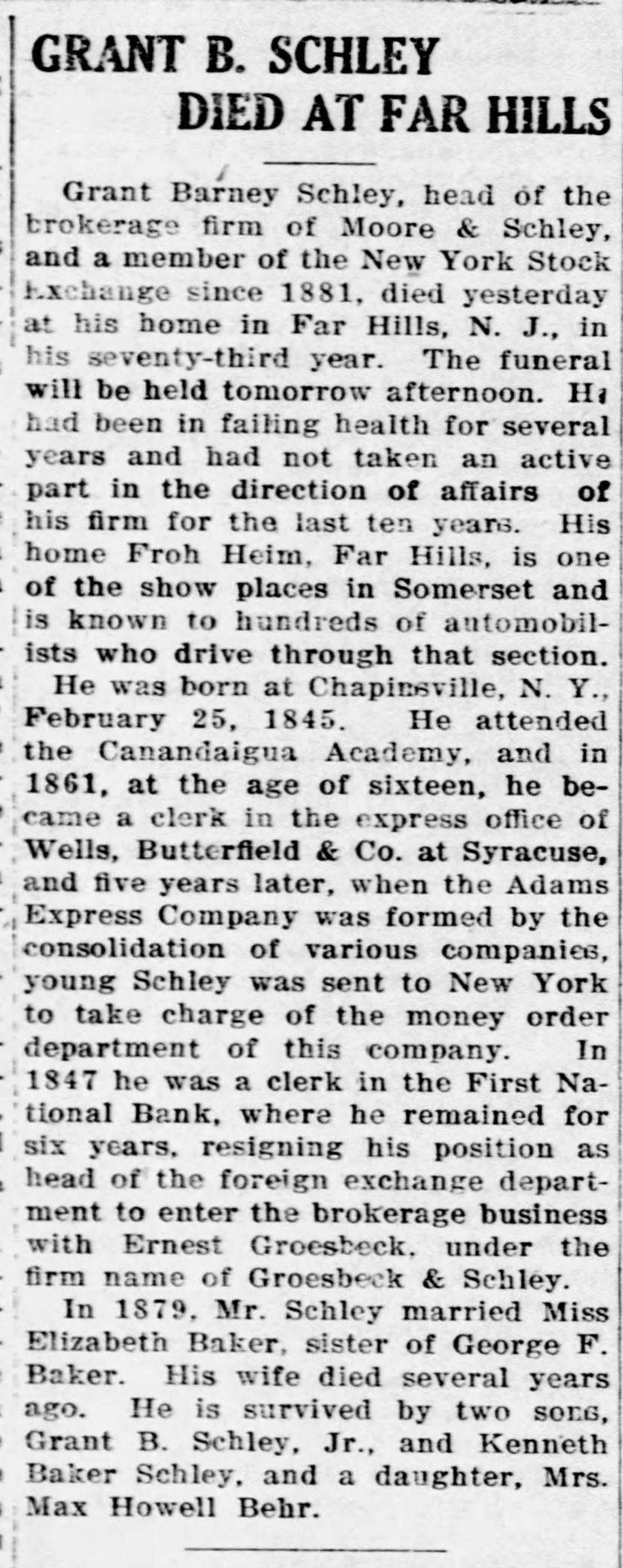 Grant Barney Schley was one of those rare Gilded Age figures whose influence still shapes the Somerset Hills long after his name slipped quietly into history. A New York financier with a sharp mind and a love for open countryside, who represented elite clients like William Rockefeller and Henry Huttleston Rogers, he and his wife, Martha, built their estate on the rolling land that would become Far Hills, a town literally named for the sweeping views from their home. Schley wasn’t just a wealthy landowner; he was a quiet architect of the region’s identity. His holdings stretched across what we now know as Bedminster and Bernards Township, including the ridge later called Schley Mountain.