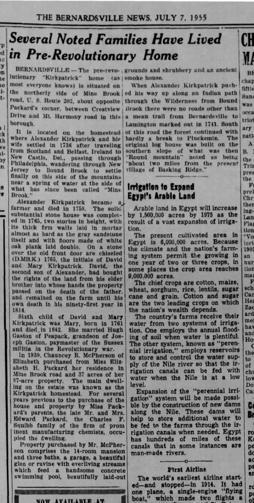 One of the first settlers, Alexander Kirkpatrick, a follower of the English-Scottish royal family, arrived in this country in 1736 and made his home near what we now call Mine Brook, carving out a life in what was then untouched forest.